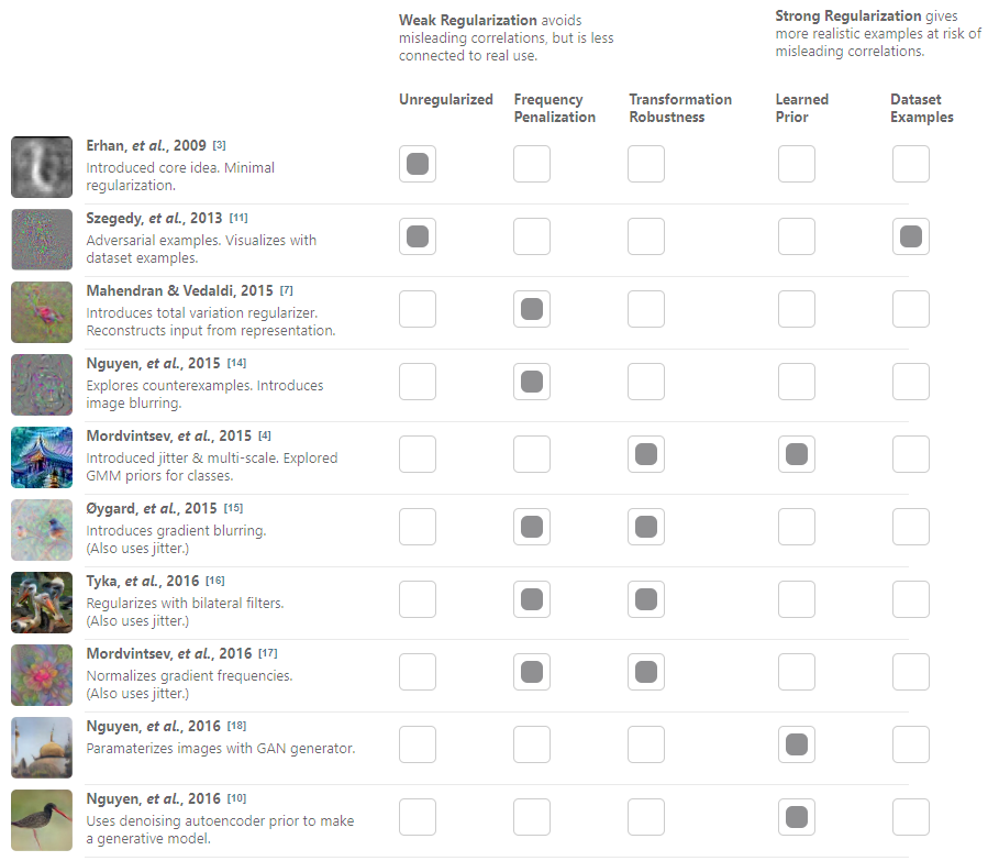정규화(regularization)는 최근 피처 시각화 연구에서 확인 할 수 있는 주요 포인트다. 이를 하나의 스펙트럼으로 나눌 수 있을 것이다. 극단적으로 아예 정규화를 하지 않으면, 적대적 예시를 얻고, 너무 강한 정규화를 하게 되면 오해를 부르는 연관성을 야기할 수 있다.