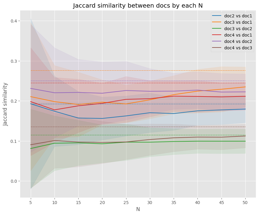 ax.set_title("Jaccard similarity between docs by each N")